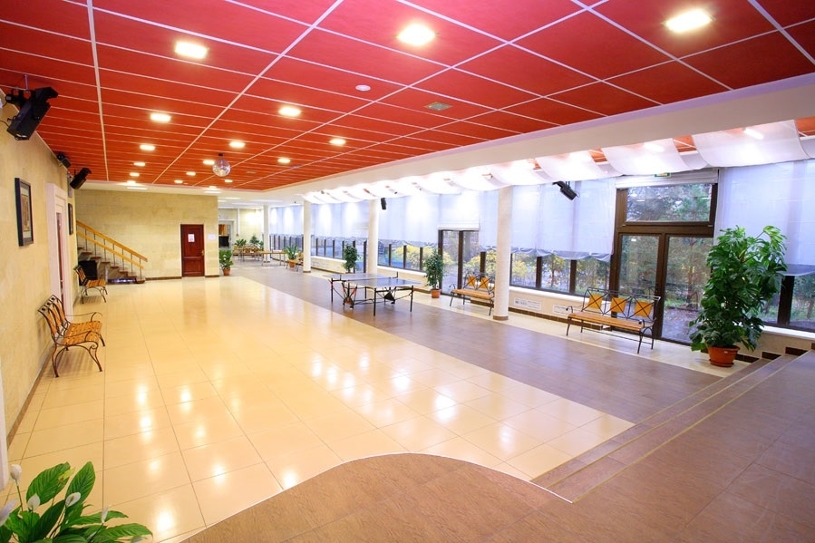 В корпусе: лечебная база, кинозал, столовая, бар, танцевальный зал, бильярдная, библиотека.